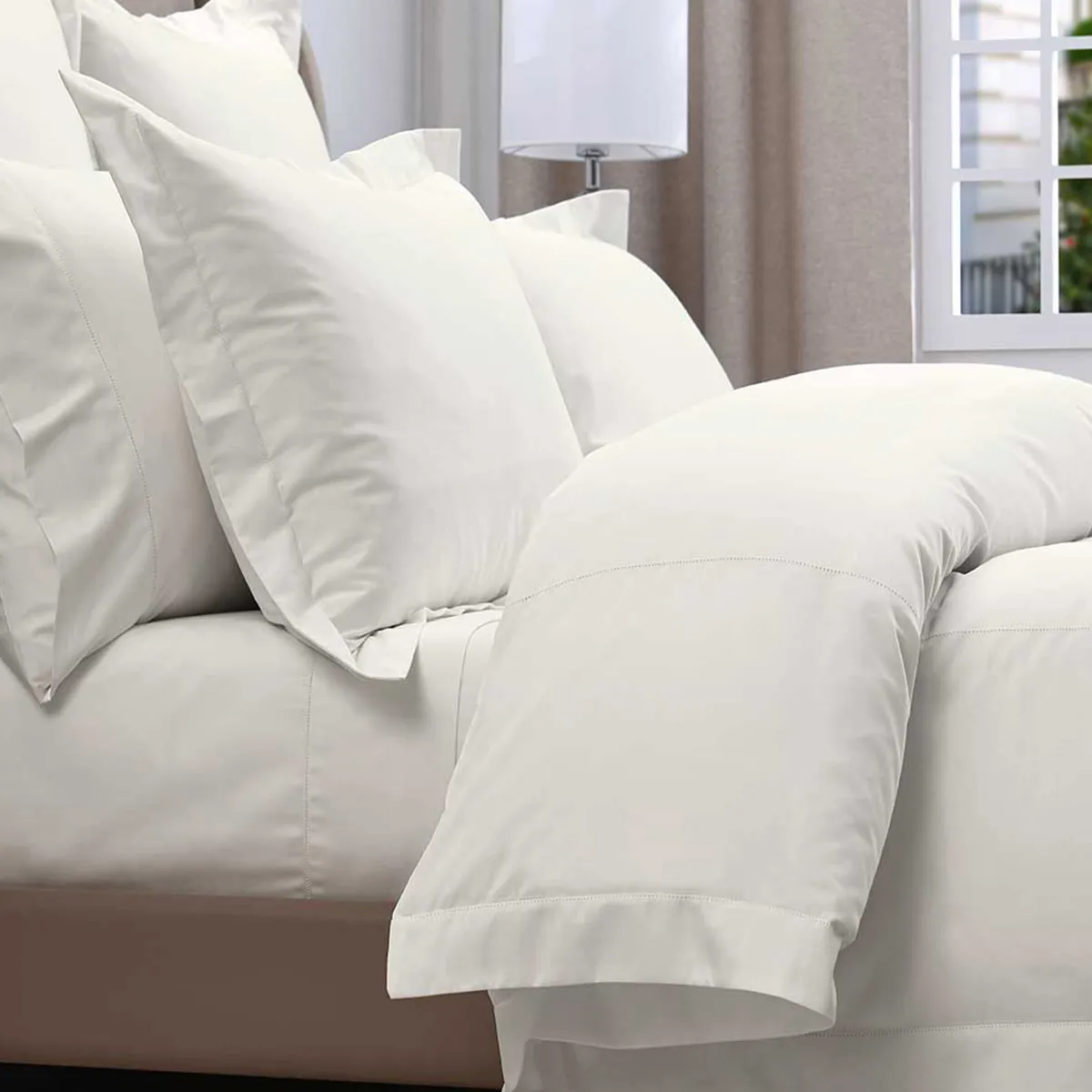 The Heirloom Picot Stitch Ivory Gulf King Duvet Cover Set is crafted from 300TC cotton sateen, featuring a central border and outer stitched border using the classic picot stitch for timeless elegance.